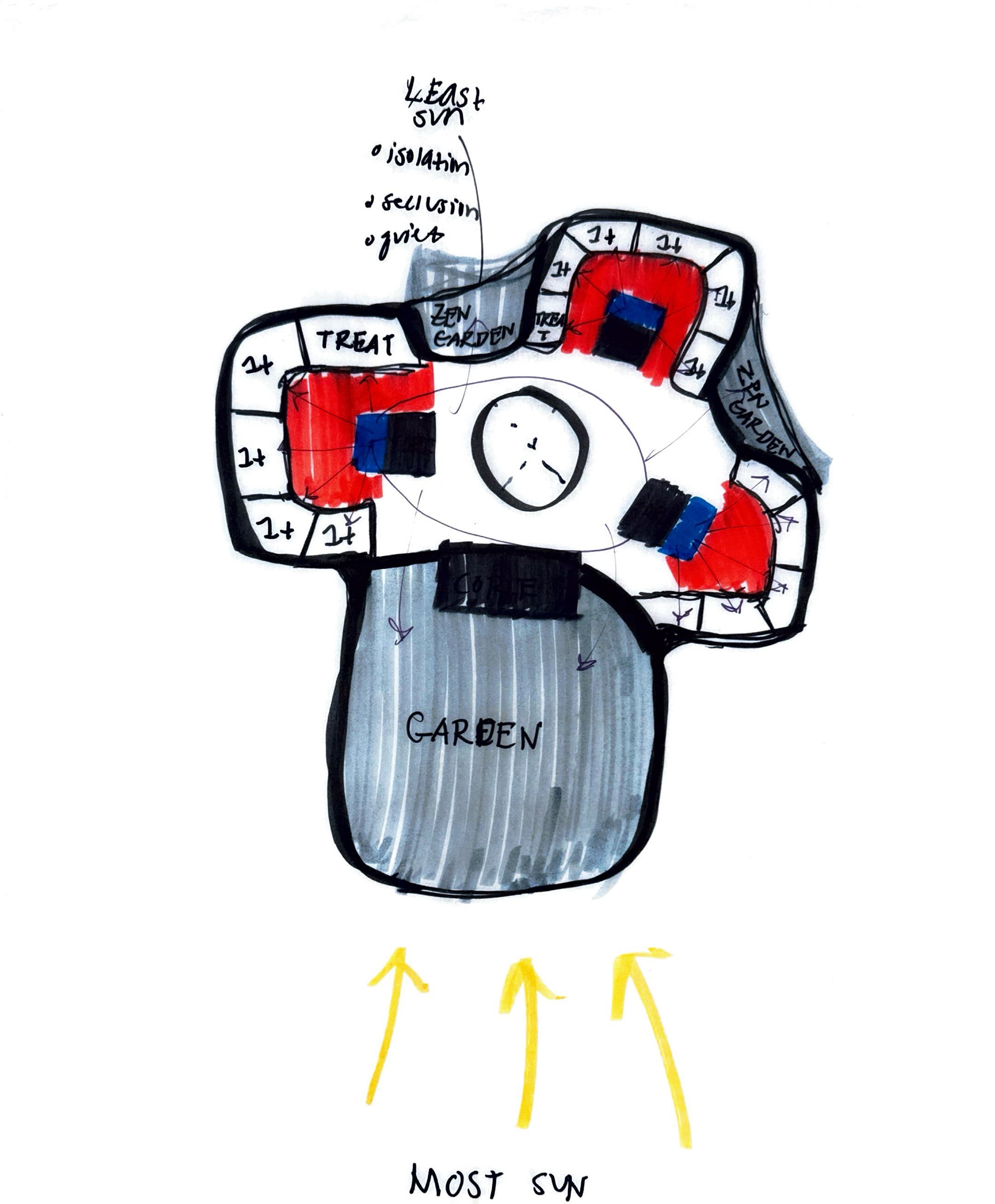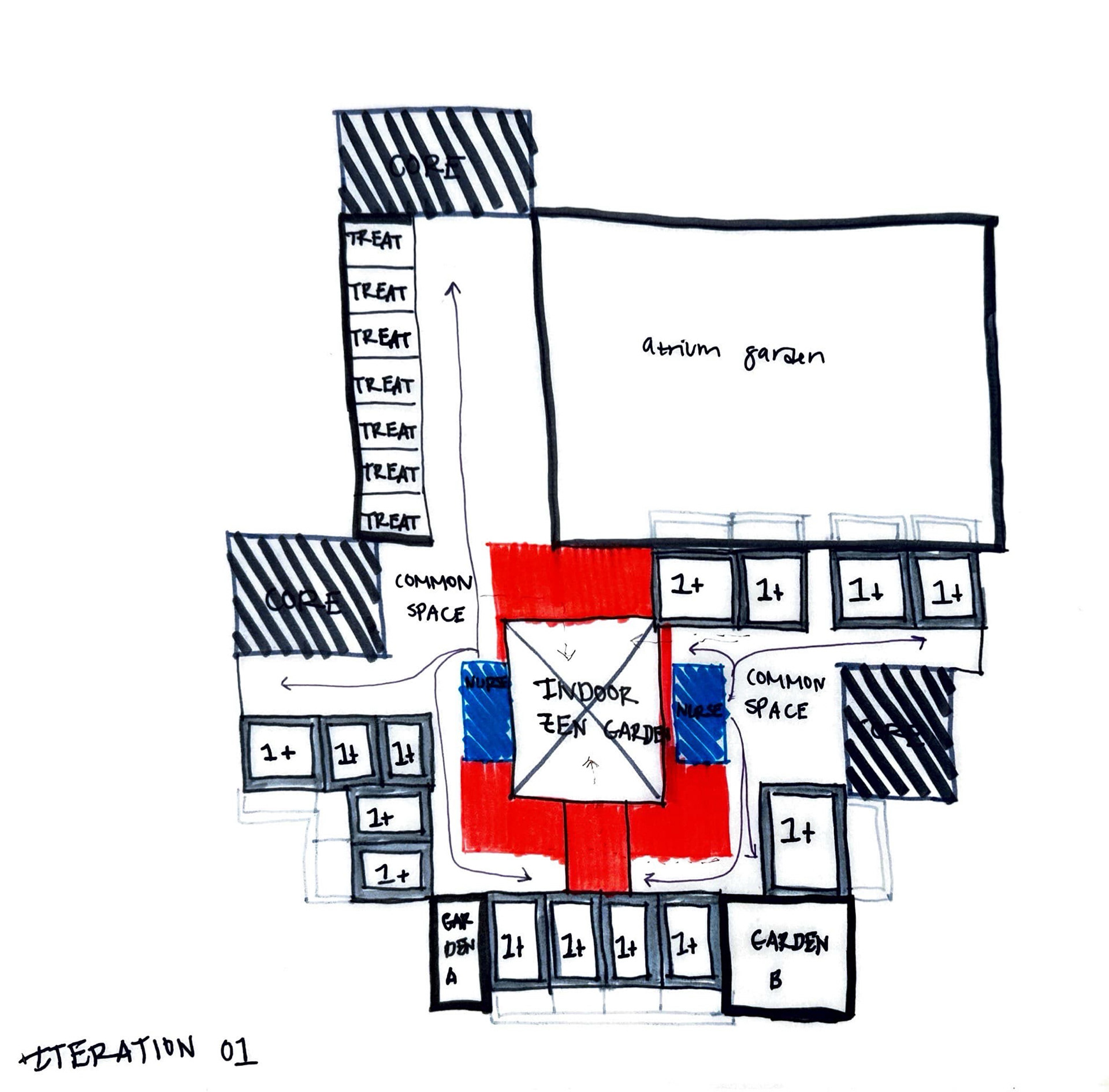 All programs will serve as rehabilitative in nature. As these natural elements transition from interior to exterior, the tower begins to serve as a beacon for the urban environment, promoting the growth and health of a city that also looks after its inhabitants. Programs include a mental health center, a medical school, and housing for medical students, patients, and physicians/medical staff. We seek to provide rehabilitative spaces not only for patients but also for the students and physicians that spend countless hours in these spaces. The residential tower also includes amenities for residents, such as a gym floor and an art room and spaces with ample green space. The mental health center has patient rooms for those deemed at higher risk/in need of more supervision, waiting rooms, offices, and treatment rooms. The medical school has a series of classrooms, labs, a campus bookstore, and a cafeteria which services the school and health center.